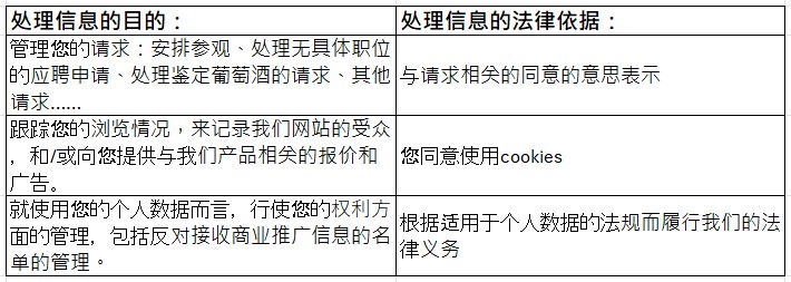 我们会通过如下渠道收集并处理您提供给我们的个人数据:通过联系表格提出咨询的请求,通过参观申请表格提出参观请求,通过鉴定服务提出鉴定葡萄酒的请求,通过无具体职位的应聘申请表或应聘某个职位的申请表进行应聘。